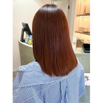 縮毛矯正×水素: 硬くなりがちな矯正後の髪を、水素の力で柔らかくしなやかな質感へ導きます。
